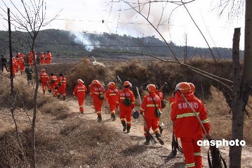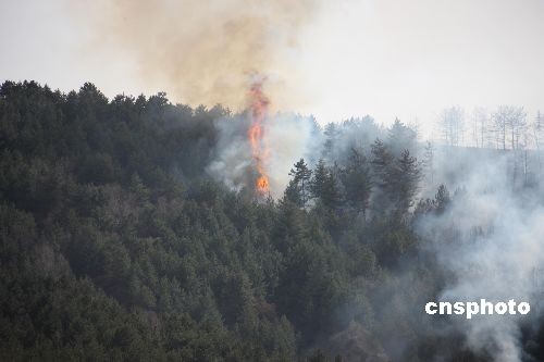 2009年3月28日下午2時左右,山西省盂縣東梁鄉(xiāng)東梁村騎龍山發(fā)生森林火災(zāi)。 森林火災(zāi)發(fā)生后,當?shù)卣⒐病⒘謽I(yè)、醫(yī)務(wù)等部門第一時間趕到現(xiàn)場,組織滅火,并啟動了相關(guān)應(yīng)急預案。當?shù)爻鰟訑?shù)百名干部群眾撲火,陽泉市武警也趕赴現(xiàn)場增援。由于火勢兇猛,在附近的村莊都能聽到火燒山林的聲音,山火的灰塵甚至飄到了最近的溫家山村。截至發(fā)稿時,沒有人員傷亡報告。中新社發(fā) 程瑜 攝