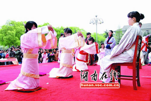 漢民族的女子成人禮又稱“笄禮”。3名少女在司儀的指引下,先在銅盆中凈手,再將長發梳發髻插入發簪,隨后起身加上一件外衣,向親人行叩拜大禮,再喝完禮酒,同樣的步驟重復3遍才算結束,歷時1個小時。