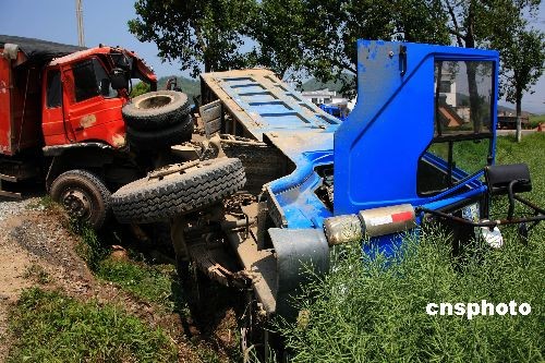 2009年4月17日11時許,在安徽休寧慈張線川湖路段發(fā)生一起嚴重車禍。一輛裝滿石子的大貨車在左拐彎時與迎面而來的一輛貨車發(fā)生了嚴重相撞,裝滿石子的大貨車被撞入2多米深的油菜田,兩車身嚴重受損,駕駛室被撞得不堪入目,兩名駕駛員受傷嚴重,被送往就近醫(yī)院搶救。據(jù)當(dāng)?shù)亟痪Q,兩車速度過快,應(yīng)處不當(dāng),是導(dǎo)致這起事故的主要原因。中新社發(fā) 方也廣德 攝