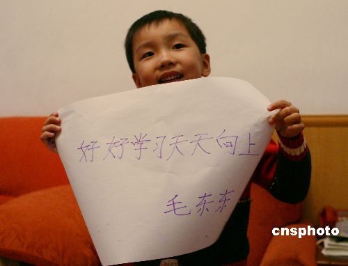 4月25日,北京,毛澤東的曾孫毛東東為中新社5月份在四川舉辦的“洗殤2008——畫冊捐贈儀式及圖片展活動”,以毛主席的“好好學習,天天向上”作為贈言,鼓勵災區兒童。中國新聞社將在四川省都江堰市舉辦“洗殤2008——畫冊捐贈儀式及圖片展活動”,向災區學校、圖書館等機構捐贈由中新社出版的《2008·鳥巢——華文傳媒關于北京奧運的影像記憶》和《四海同心——全球華僑華人支持中國抗震救災紀實》。希望能以微薄之力安慰在災難中痛失親人的同胞,幫助他們在重建家園的同時,重新構建起心靈家園。捐贈儀式及圖片展覽活動期間,中新社將向參觀者及災區民眾贈送印有精美圖片的心語卡片。中新社發 于正 攝