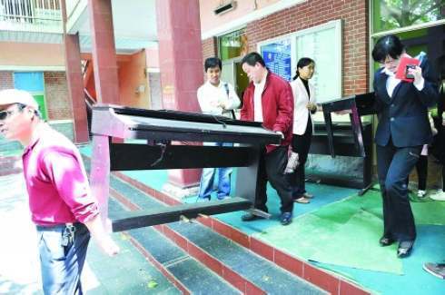 中午12點左右,部分家長開始把教室里的設施往外搬。幾位家長把數碼鋼琴房里的一架電子鋼琴搬出了教室。“這個教室里原來有9架鋼琴,現在還剩7架,這一架是我占的。”一位50歲上下的女士對記者說,“我覺得復課是不大可能了,要求退錢又找不到領導,只好搬點東西作抵押了。”