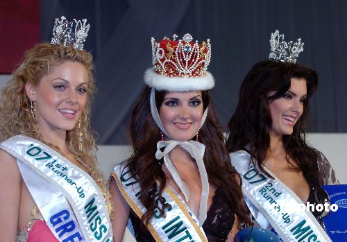 10月15日晚上,2007年國際小姐選美大賽決賽在日本東京舉行,六十一位佳麗參加角逐。經過民族服裝、泳裝和晚禮服等項目激烈的競爭,最終2007年國際小姐由墨西哥小姐Priscilla Perales獲得,亞軍由希臘小姐Despoina Vlepaki獲得,而季軍則由白俄羅斯小姐Yuliya Iindzeyeva摘取。來自中國香港的香港小姐王君馨獲得2007國際友誼小姐的獎項。中新社發 滕劍峰 攝