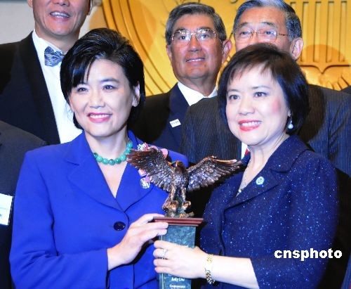 七月二十三日晚,國際領(lǐng)袖基金會(huì)在華盛頓舉行頒獎(jiǎng)晚會(huì),獎(jiǎng)勵(lì)杰出的亞裔人士,在美國國會(huì)中僅有的兩名華裔議員吳振偉、趙美心分別獲得“年度杰出公職服務(wù)獎(jiǎng)”。圖為美國“國際領(lǐng)袖基金會(huì)”執(zhí)行長、曾任美國商務(wù)部少數(shù)族裔發(fā)展署副署長兼幕僚長的華裔政界名媛董繼玲(右),向美國華裔女眾議員趙美心頒獎(jiǎng)。國際領(lǐng)袖基金會(huì)為全美最著名的亞裔青年領(lǐng)袖訓(xùn)練機(jī)構(gòu),每年定期表揚(yáng)促進(jìn)國際經(jīng)貿(mào)繁榮、發(fā)揚(yáng)中華文化傳承有卓越成就的杰出人士。中新社發(fā) 吳慶才 攝
