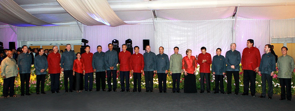 11月14日晚,出席觀看《新加坡之夜》的APEC各成員領(lǐng)導(dǎo)人拍攝了合影,剛剛抵達(dá)新加坡的美國總統(tǒng)奧巴馬也參加了合影。 >>點擊此處可看大圖