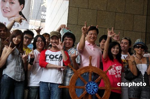 來(lái)自海峽兩岸及香港、澳門(mén)等地的多個(gè)搖滾樂(lè)隊(duì),將從7月10日起一連3天在臺(tái)北縣貢寮海洋音樂(lè)祭上演唱。圖為7月9日下午,臺(tái)北縣長(zhǎng)周錫瑋(前排右三)、縣觀光旅游局局長(zhǎng)秦慧珠(前排右二)與眾樂(lè)隊(duì)成員,在音樂(lè)祭啟動(dòng)記者會(huì)上做出搖滾手勢(shì)。中新社發(fā) 董會(huì)峰 攝
