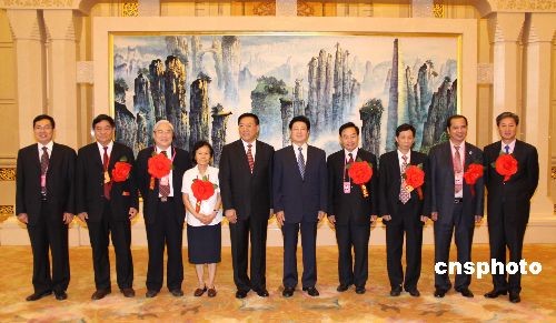 7月14日,全國“僑界十杰”在北京人民大會與全國人大常委會副委員長王兆國、中國僑聯主席林軍合影。當日,全國“僑界十杰”評選產生,獲選的是:北京華騰東光科技發展有限公司高級工程師羅益鋒,吉林大學汽車學院教授郭孔輝,福建省光學技術研究所高級工程師賴愛光,中國科學院海洋研究所研究員鄭守儀,廣東韶關鋼鐵集團有限公司主任工程師、高級技師羅東元,海南省農墾總局副局長、南田農場場長彭隆榮,中國科學院院士、世界著名數學家吳文俊,國家體育總局體操中心副主任、國家級教練黃玉斌,中國航空工業集團公司北京航空材料研究院高級顧問顏鳴皋,神華集團有限公司總經理張玉卓。中新社發 史利 攝