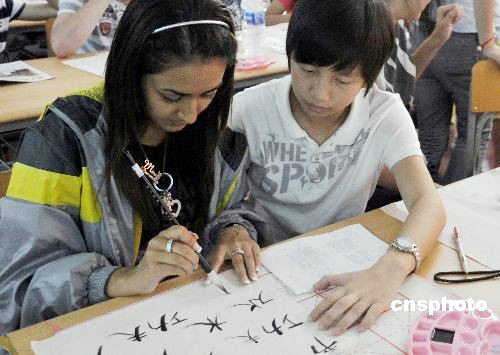 7月24日,正在重慶參加“漢語橋——英國學(xué)生夏令營”的33名英國中學(xué)生在認(rèn)真學(xué)習(xí)寫漢字。“功夫”、“茶”、“瓷器”等富有濃郁中國傳統(tǒng)文化的字詞,成為他們學(xué)得最快最好的漢字。由英國兒童學(xué)校和家庭部、中國國家漢語國際推廣領(lǐng)導(dǎo)小組辦公室共同主辦的“漢語橋——英國學(xué)生夏令營”20日在重慶開營。中新社發(fā) 郭晉嘉 攝