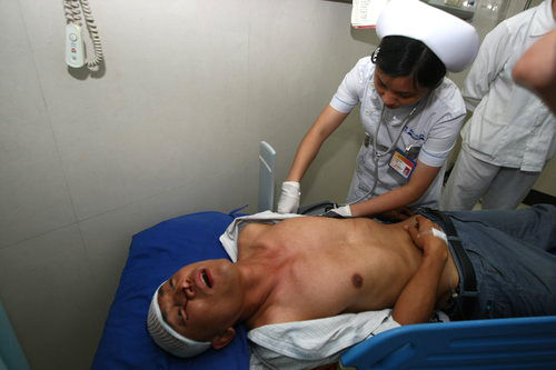 目擊于小龍被執(zhí)法人員毆打的小販林先生告訴記者,突然間4名身穿制服的執(zhí)法人員沖過(guò)來(lái)沒(méi)收東西。于小龍想從執(zhí)法人員手里搶回貨,卻換來(lái)一頓暴打。“滿臉都是血。”林先生說(shuō)。記者在南城醫(yī)院看到于小龍?zhí)稍诖采仙胍鳎^腦還比較清醒,稱打傷他頭部的是執(zhí)法人員手持的DV機(jī)。