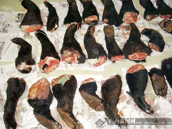 6月7日,廣西警方破獲一起特大走私案。一犯罪團伙以運廢紙的名義,將173只熊掌及其他走私物品運至防城港市時,被警方抓獲。