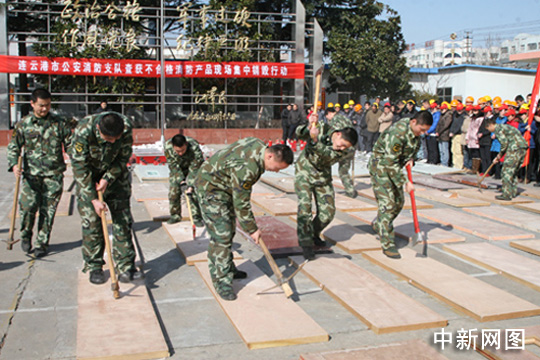 中新網連云港3月10日電 (蘇欣 吳茂新 朱曉穎)10日上午,在連云港市消防支隊營區院內,由消防部門聯合工商、質監共同查獲的不合格滅火器、消火栓、消防應急照明燈等520余件消防假冒偽劣產品被集中銷毀。