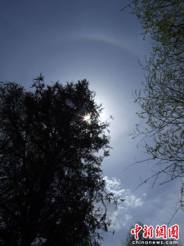 中新網(wǎng)5月23日電 (高峰毅 焦瑾琦) 近日,華北地區(qū)氣溫居高不下。5月21日晚9時許,山西五臺山出現(xiàn)了月暈現(xiàn)象,持續(xù)了近一個小時。而第二天,即22日上午9時許,五臺山上空又出現(xiàn)了日暈奇觀,,并持續(xù)了兩個多小時。這兩種暈的出現(xiàn)時間差不足12小時,著實令人稱奇。
