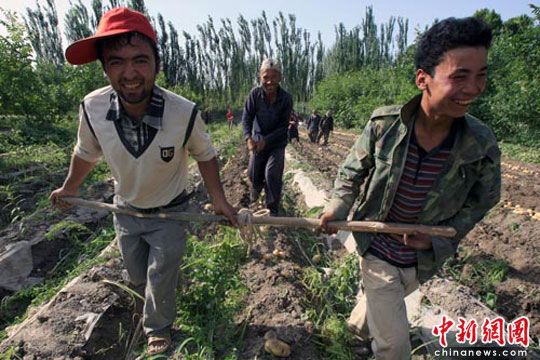 6月2日,新疆喀什地區(qū)澤普縣維吾爾族農(nóng)民正在田間收獲早熟土豆。該縣共種植早熟土豆4萬余畝,畝產(chǎn)1500公斤左右,每畝地至少可為當(dāng)?shù)剞r(nóng)民增加收入3000元人民幣。據(jù)該縣政府工作人員介紹,該縣早熟土豆的陸續(xù)上市,也為平抑了虛高的蔬菜價格起到了作用。