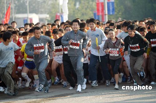 十月二十一日,2007年全日空北京國際馬拉松賽在北京國家奧林匹克體育中心鳴槍開跑,陸毅、馬伊俐等影視演員以及北京國安足球隊隊員徐云龍等參加了馬拉松比賽。中新社發 盛佳鵬 攝