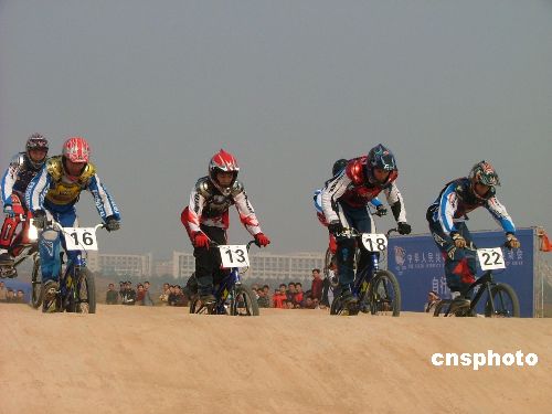 十月二十二日上午,第六屆全國城運會BMX(小輪車)男子越野賽在洛陽賽區舉行,運動員們經過幾個回合的預賽較量后進入決賽,香港運動員王史提芬率先奪得男子冠軍,煙臺市的孫越、大同市的任超分列二、三名。中新社發 史寶銀 攝