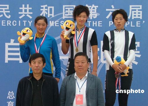 十月二十三日,第六屆城市運動會自行車場地賽在河南洛陽新區體育中心開賽,女子三公里個人追逐賽冠軍被煙臺市隊的姜帆(中)奪得,北京順義隊的王翠、煙臺隊的姜吻吻分獲二、三名。中新社發 史寶銀 攝