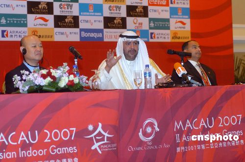 十月二十八日,亞奧理事會主席薩巴赫親王(中)在澳門第二屆亞洲室內運動會記者會上,盛贊第二屆亞洲室內運動會的組織工作非常成功,今后會更加成功。中新社發 史利 攝