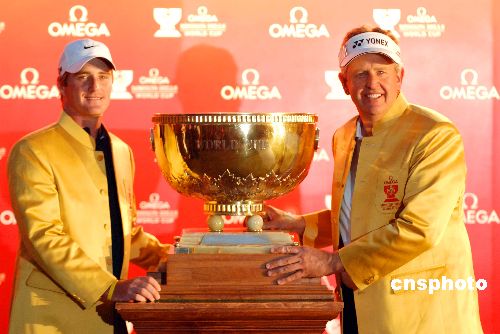 蘇格蘭隊選手科林.蒙哥瑪利(右)/馬克.沃倫十一月二十五日經過四輪鏖戰以負二十五桿的總成績奪得在深圳舉辦的歐米茄觀瀾湖高爾夫世界杯冠軍。中新社發 陳文 攝