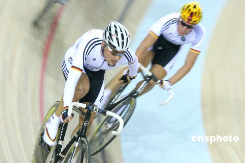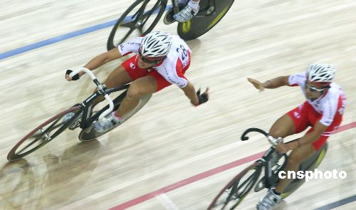 12月9日,“好運北京”2007-2008國際自盟場地自行車世界杯賽在老山自行車館閉幕。圖為最后一項男子麥迪遜40公里的決賽。在男子麥迪遜賽中,每隊有兩名選手組成,是完成途中沖刺的比賽。根據各隊完成比賽的距離和所獲得的沖刺得分,可以決定最終的名次。此外,如果一支隊伍能夠領先其他車隊一圈或一圈以上,那無論沖刺得分是多少都將獲勝。中新社發 富田 攝
