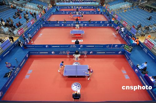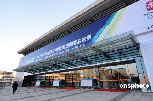 12月13日,新近落成的北京大學奧運乒乓球館迎來“好運北京”2007年ITTF職業巡回賽總決賽。奧運乒乓球館可提供固定與活動座位共7557座,其中位于首層的比賽場地長47米,寬39.5米,最多可布置8張乒乓球臺同時進行比賽。放入活動座椅后,賽場變為長27米,寬20米,可放置2張乒乓球臺進行比賽。中新社發 吳芒子 攝