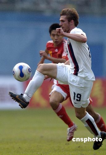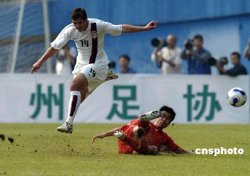 2007年12月16日下午,中國國奧隊與美國國奧隊的第二場友誼賽在廣州越秀山體育場鳴哨。在上半場比賽中,大幅調(diào)整陣容的中國國奧隊完全被對手壓制,美國隊由羅杰斯、蘭尼和達維斯各入一球,早早以3比0領(lǐng)先。國奧隊主帥杜伊在下半場頻繁換將,國奧小將們展開反撲,朱挺、杜震宇相繼送出精彩入球,最終比分為3比3。補時階段王曉龍不理智的犯規(guī)引發(fā)雙方?jīng)_突,其與克里斯坦雙雙被罰下。中新社發(fā) 吳峻 攝