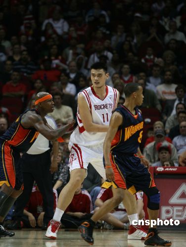 休斯頓火箭隊三十一日晚在主場豐田體育中心以九十五比一百一十二負于來訪的金州勇士隊。姚明在比賽中僅有八次出手,得到了十六分。阿爾斯通拿下火箭隊當晚最高的二十二分。圖為當日的比賽。中新社發 楊晉生 攝