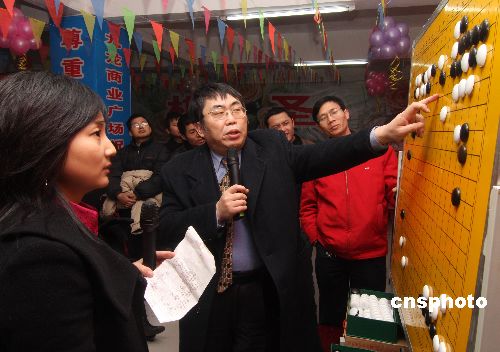 1月15日,聶衛平在湖南漣源市與5位棋手展開車輪大戰。當日,聶衛平與漣源市迎奧運首屆“九龍杯圍棋大獎賽”冠軍胡軍民、亞軍潘勇、劉小希等5位棋手展開車輪大戰。聶衛平分別讓給他們2-4個子,經過2個多小時的決戰,聶衛平“輸”給胡軍民、潘勇、劉小希3人,贏取另2人。賽后聶衛平為婁底市百多名棋手講解精彩圍棋。中新社發 郭國權 攝