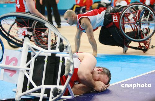 1月22日,“好運(yùn)北京”2008年國際輪椅籃球邀請賽在北京國家體育館繼續(xù)進(jìn)行,在男子組最后一輪比賽中,雅典殘奧會(huì)冠軍加拿大隊(duì)以69比47戰(zhàn)勝中國隊(duì)。三輪循環(huán)賽過后,加拿大隊(duì)2勝1負(fù)很可能獲得預(yù)賽第二名,中國隊(duì)三戰(zhàn)皆負(fù)排名第四。圖為比賽中加拿大隊(duì)兩名隊(duì)員由于拼搶激烈摔倒在球場上。中新社發(fā) 廖文靜 攝