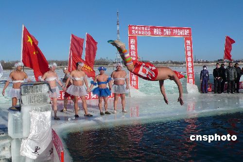 1月27日,黑河市冬泳俱樂(lè)部、俄羅斯遠(yuǎn)東冬泳俱樂(lè)部聯(lián)合在黑龍江畔舉辦“迎奧運(yùn),賀新春、強(qiáng)體魄、促和諧”為主題的系列體育競(jìng)賽活動(dòng)。當(dāng)日,黑河冬泳俱樂(lè)部的隊(duì)員們身著自制的芭蕾服裝偏偏起舞,他們還和俄羅斯遠(yuǎn)東冬泳俱樂(lè)部共計(jì)200余名隊(duì)員,先后進(jìn)行了“與奧運(yùn)同行”沿黑龍江江堤徒步宣傳活動(dòng)、雪地足球?qū)官悺⒍颈硌莸认盗畜w育競(jìng)賽活動(dòng),表達(dá)了邊城健兒們向往2008奧運(yùn)會(huì)的共同愿望和對(duì)全國(guó)人民新春佳節(jié)美好祝福。據(jù)悉,參加本次活動(dòng)最大年齡的隊(duì)員為75歲。中新社發(fā) 邱齊龍 攝