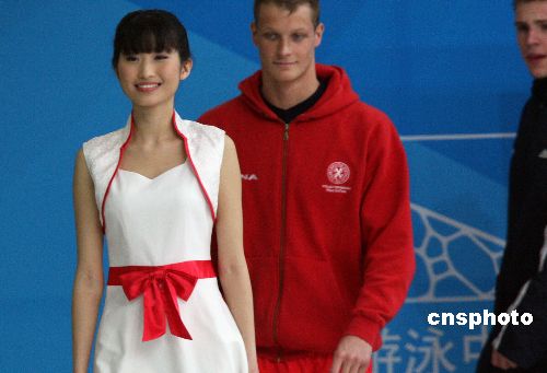 2月1日,“好運北京”中國游泳公開賽舉行六個項目的決賽,以大學(xué)生為主的頒獎禮儀小姐為備戰(zhàn)北京奧運會現(xiàn)場熱身。中新社發(fā) 任晨鳴 攝