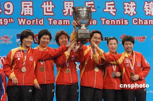 3月1日晚,中國隊在四十九屆世乒賽女團決賽中3比1擊敗新加坡隊奪得冠軍,連續第8次舉起考比倫杯。中新社發 柯小軍 攝