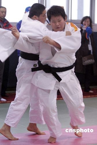 三月十二日,世界冠軍佟文(右)等中國女子柔道隊優秀選手在天津訓練基地與男選手對練,為奧運奪金積極備戰。中新社發 毛建軍 攝