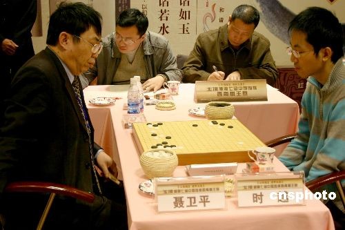 3月25日,“玉溪杯”中國圍棋西南棋王賽在成都開戰,來自川、貴、渝、滇四支圍棋隊的16位強手紋枰爭戰,角逐新一屆“西南王”。中國棋界泰斗聶衛平九段是該賽事的常客。圖為聶衛平九段首輪(左一)對陣小棋手時越。中新社發 楊杰 攝