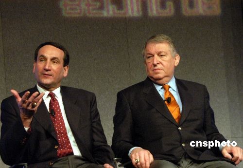 美國男籃主教練邁克·沙舍夫斯基(左)15日與美國籃球國家隊組建委員會主席科蘭杰洛(右)一同在芝加哥出席美國奧運代表隊新聞峰會時稱:“美國人必須贏”的觀念已經過時,此次奧運奪金并非美國男籃的唯一目標。 中新社發 李靜 攝