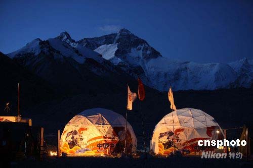 5月8日凌晨,北京奧運圣火登珠峰,珠峰大本營燈火通明。中新社發 盛佳鵬 攝