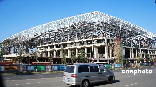 2008年11月8日,沈陽(yáng)奧體中心綜合體育館已現(xiàn)形。該館可容納8000名觀眾,可滿足羽毛球、乒乓球、體操、拳擊等賽事對(duì)場(chǎng)館的要求,還可舉辦大型音樂(lè)會(huì)、演唱會(huì)。沈陽(yáng)奧體中心建筑群“一場(chǎng)三館”,由奧體中心一座體育場(chǎng)、一座綜合體育館、一座游泳館和一座網(wǎng)球館組成。中新社發(fā) 劉寶成 攝