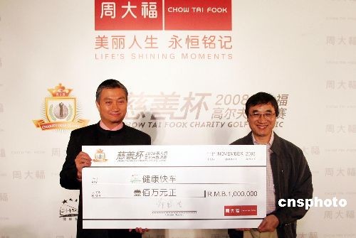 圖為周大福董事鄭錫鴻先生向健康快車主席陳振彬先生(左)捐贈(zèng)本次邀請(qǐng)賽籌募的100萬(wàn)元善款。