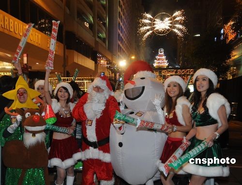 十二月二十四日晚(平安夜),逾十萬市民及游客齊聚香港尖沙咀鬧市,參加圣誕倒數街頭派對,圣誕老人、圣誕女郎及雪人在場助興,節日氣氛濃厚。中新社發 蔡蔓莉 攝