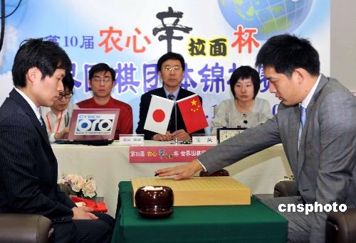 二月十七日,第十屆“農心杯”世界圍棋團體錦標賽第三階段比賽在上海舉行,首戰由中國棋手常昊九段(右)挑戰日本擂主高尾紳路九段(左),本階段比賽將決出最后冠軍和2億韓元冠軍獎金的歸屬。中新社發 湯彥俊 攝