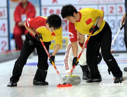 2月26日14時,哈爾濱,大冬會男子冰壺銅牌爭奪戰(zhàn)在黑龍江滑冰館進行,中國隊迎戰(zhàn)韓國隊。經(jīng)過二個半小時的較量,最終中國隊以9:5戰(zhàn)勝韓國隊,獲得銅牌。中新社發(fā) 王忠言 攝