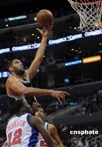 NBA勁旅圣安東尼奧馬刺隊三月二日晚在客場迎戰(zhàn)洛杉磯快船隊,結果以106比78大勝主隊,馬刺隊大前鋒鄧肯全場獨得16分。中新社發(fā) 張煒 攝