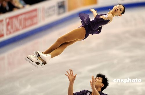 當地時間三月二十五日晚,在二00九年花樣滑冰世界錦標賽雙人滑決賽中,中國選手張丹/張昊獲得亞軍。中新社發 張煒 攝