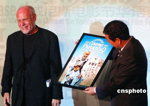 10月26日,威尼斯電影節(jié)主席馬爾科·默勒爾出席在蘇州舉行的中國金雞百花電影節(jié),并在水城影展活動中向蘇州市政府贈送親筆用中文寫下的“上有天堂,下有天堂電影院——蘇州”的威尼斯電影節(jié)宣傳海報。中新社發(fā) 邱勇 攝