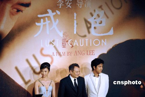 十月三十一日晚,《色,戒》在上海啟動內地上映,導演李安(中)和主演湯唯(左)、王力宏出席儀式。 該影片已經在中國香港和臺灣地區創造了新的票房紀錄。中新社發 曹子琛 攝