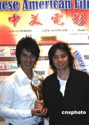 中國(guó)藏族演員蒲巴甲(左)在電影《喜瑪拉雅王子》里的出色表演,獲得中美電影節(jié)“金天使獎(jiǎng)”,當(dāng)?shù)貢r(shí)間十一月七日晚他與導(dǎo)演胡雪樺趕到洛杉磯手捧獎(jiǎng)杯與媒體見(jiàn)面,感慨自己從九寨溝走向了好萊塢。中新社發(fā) 賈國(guó)榮 攝