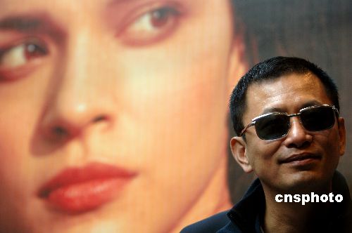 著名華人導(dǎo)演王家衛(wèi)在其首部英語電影《藍莓之夜》新聞發(fā)布會的海報前。
