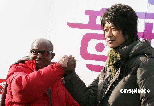 2008年1月2日下午,在北京林業大學體育場里,臺灣歌手游鴻明同坦桑尼亞奧運英雄阿赫瓦里共同完成奧運歌曲音樂電視《英雄》的場景拍攝。 中新社發 博芽影像 攝