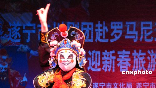 1月15日至30日,四川省遂寧市川劇團將應旅羅華商聯合會邀請,代表中國到羅馬尼亞作文化交流演出。據悉,這次赴羅馬尼亞文化交流演出,遂寧市川劇團共被選中《茶藝》、《手影》、《變臉吐火》、《川劇集錦》、川劇精品戲《鐘馗嫁妹》、《獅舞》等6個精品節目參演。首場演出在羅馬尼亞皇家歌舞劇院舉行。屆時,將有50余個國家的駐羅使節到場觀看。圖為四川省遂寧市川劇團演員在演出精品川劇節目。中新社發 鐘敏 攝