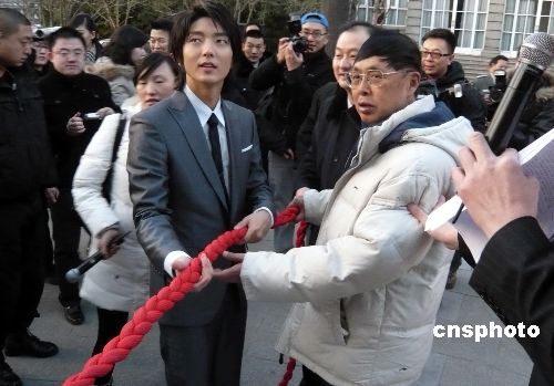 1月13日,愛浪(國際)文化產(chǎn)業(yè)集團(tuán)與韓國COMA公司在北京中國人民對外友好協(xié)會舉行締結(jié)聯(lián)盟簽約儀式,雙方將在多個文化項(xiàng)目上進(jìn)行合作,圖為在簽約儀式前中國人民對外友好協(xié)會會長陳昊蘇與“中韓文化交流大使”韓國人氣偶像李俊基等一起敲響“和平友誼鐘”。中新社發(fā) 錢興強(qiáng) 攝