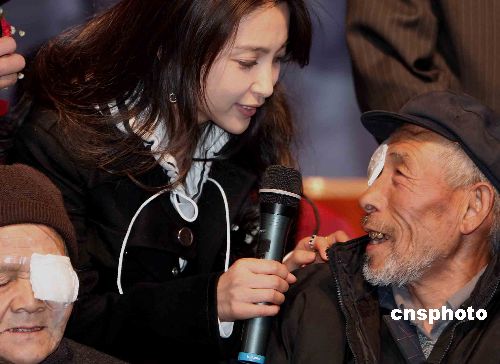 中國演藝明星李冰冰,1月28日在陜西省蒲城慰問剛剛通過慈善手術復明的貧困農民白內障患者。當日揭牌的“陜西蒲城‘亮睛’扶貧眼科中心”,是由香港醫學界熱心人士發起、在香港注冊成立的“亮睛工程慈善基金”實施的“亮睛工程”的一部分,該工程計劃未來五年在中國人口多的貧困地區設立100個扶貧眼科中心(亮睛點),每個中心每年實施1000例白內障手術,大力協助中國的扶貧除盲重任。中新社發 任晨鳴 攝