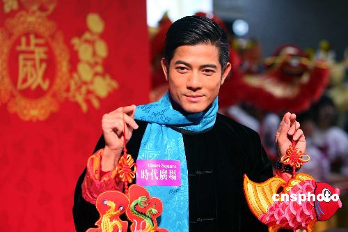 二月十一日,香港影視紅星郭富城出席時代廣場舉行的“金龍醒獅賀新歲”慶典,向商戶和顧客拜年。中新社發 洪少葵 攝